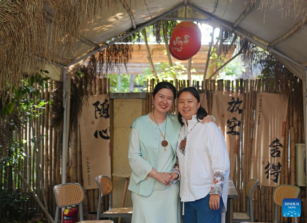 Si Fangfang (R) and Li Wen pose for a photo at the courtyard of "Jinkun Xinshe," a traditional Chinese-style handicraft studio, in Xuhui District of Shanghai, east China, April 18, 2025. "Jinkun Xinshe" was founded by Si Fangfang and Li Wen, who have converted a foreign-style house into a tranquil and elegant space to offer traditional handicraft courses such as bracelet making, rope braiding, incense crafting, and gold foil painting.(Xinhua/Liu Ying)