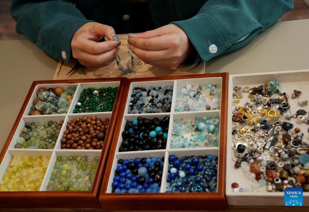 Li Wen introduces the bracelets made by customers and herself at "Jinkun Xinshe", a traditional Chinese-style handicraft studio, in Xuhui District of Shanghai, east China, April 18, 2025. "Jinkun Xinshe" was founded by Si Fangfang and Li Wen, who have converted a foreign-style house into a tranquil and elegant space to offer traditional handicraft courses such as bracelet making, rope braiding, incense crafting, and gold foil painting.(Xinhua/Liu Ying)