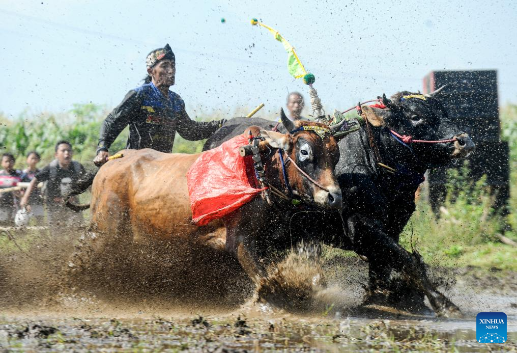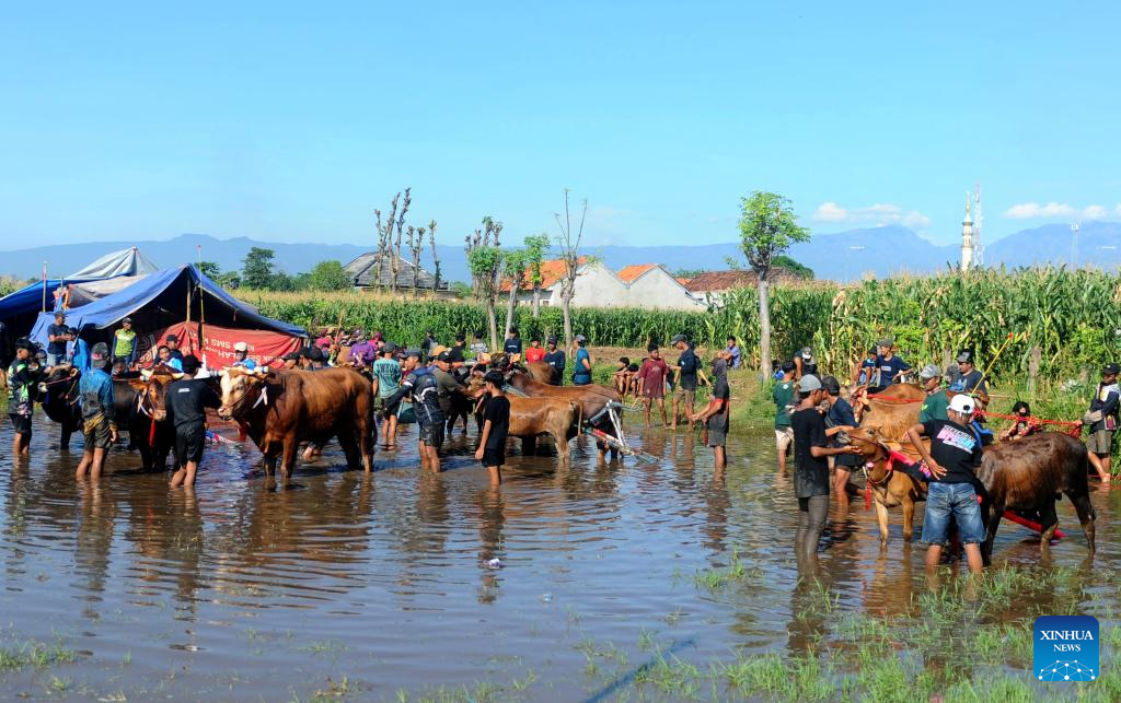 Participants prepare their bulls for Karapan Sapi Brujul, a traditional bull racing event, in Jrebeng Kidul village, Probolinggo Regency, East Java, Indonesia, May 4, 2025. (Photo by Sahlan Kurniawan/Xinhua)