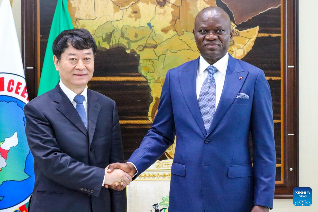 Gabonese President Brice Clotaire Oligui Nguema meets with Chinese President Xi Jinping's special envoy Mu Hong, also the vice chairperson of the National Committee of the Chinese People's Political Consultative Conference, in Libreville, capital of Gabon, May 4, 2025. At the invitation of Gabonese President Brice Clotaire Oligui Nguema, Mu attended Nguema's inauguration ceremony on May 3 in Libreville, the capital of Gabon. On May 4, the Gabonese president met with Mu in Libreville. (Photo by Ibouanga Tchikaya/Xinhua)