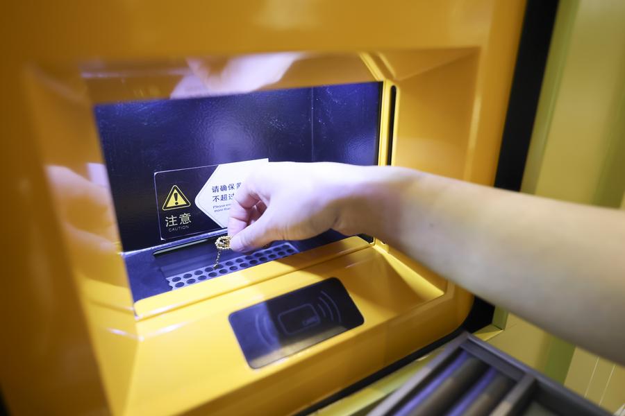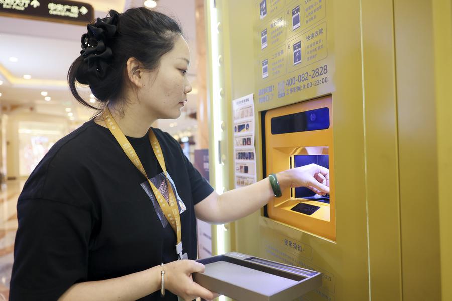 A staff member places gold jewelry into the gold recycling device of a "smart gold store" at a shopping mall in Shanghai, east China, May 5, 2025. (Xinhua/Wang Xiang)