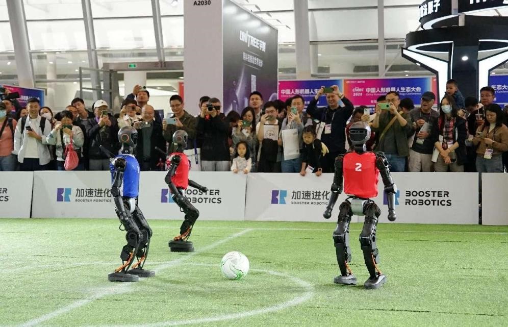 A robot soccer game is held at the 2025 China Humanoid Robot Ecology Conference in Shanghai, April 25, 2025. (People's Daily Online/Ma Weiqin)