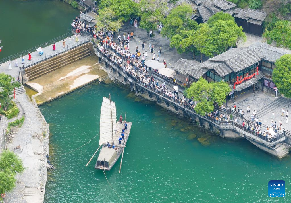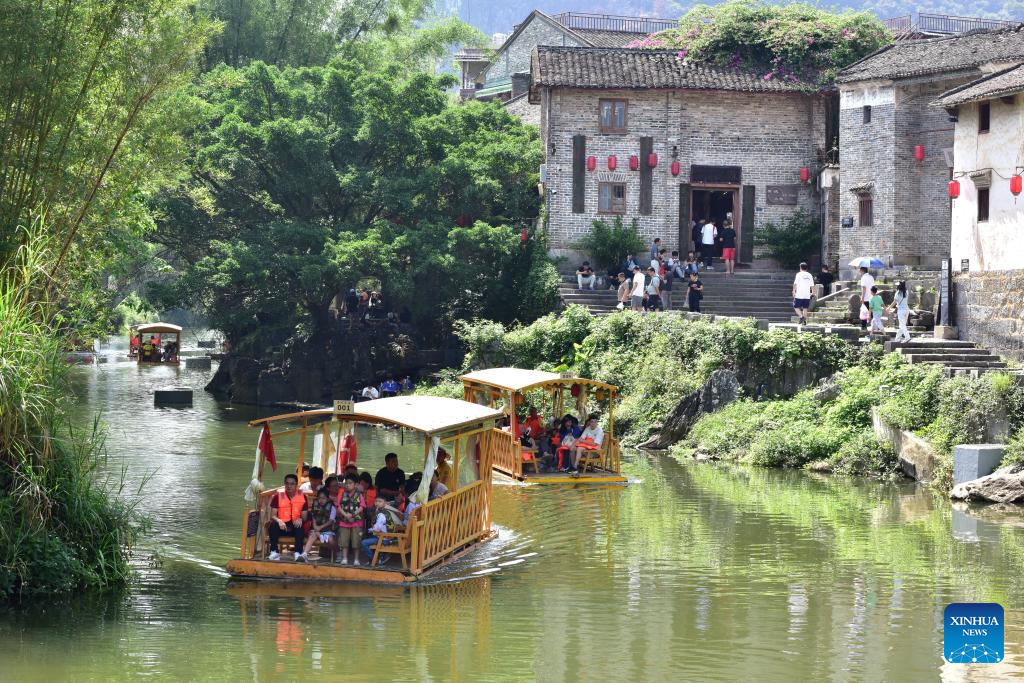 Tourists take boats to visit the Huangyao ancient town in Zhaoping Couty, south China's Guangxi Zhuang Autonomous Region, May 2, 2025. Chinese tourists made 314 million domestic trips and spent 180.3 billion yuan (roughly 25 billion U.S. dollars) from May 1 to 5, marking 6.4 percent and 8 percent year-on-year rises respectively, according to official figures. (Photo by Liao Zuping/Xinhua)