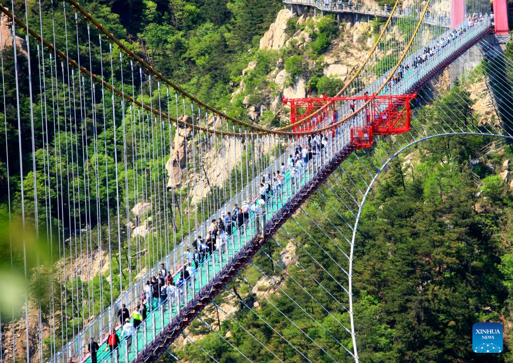 An aerial drone photo taken on May 3, 2025 shows tourists walking a pedestrian suspension bridge built in the Yimeng mountains in Linyi, east China's Shandong Province. Chinese tourists made 314 million domestic trips and spent 180.3 billion yuan (roughly 25 billion U.S. dollars) from May 1 to 5, marking 6.4 percent and 8 percent year-on-year rises respectively, according to official figures. (Photo by Wu Jiquan/Xinhua)