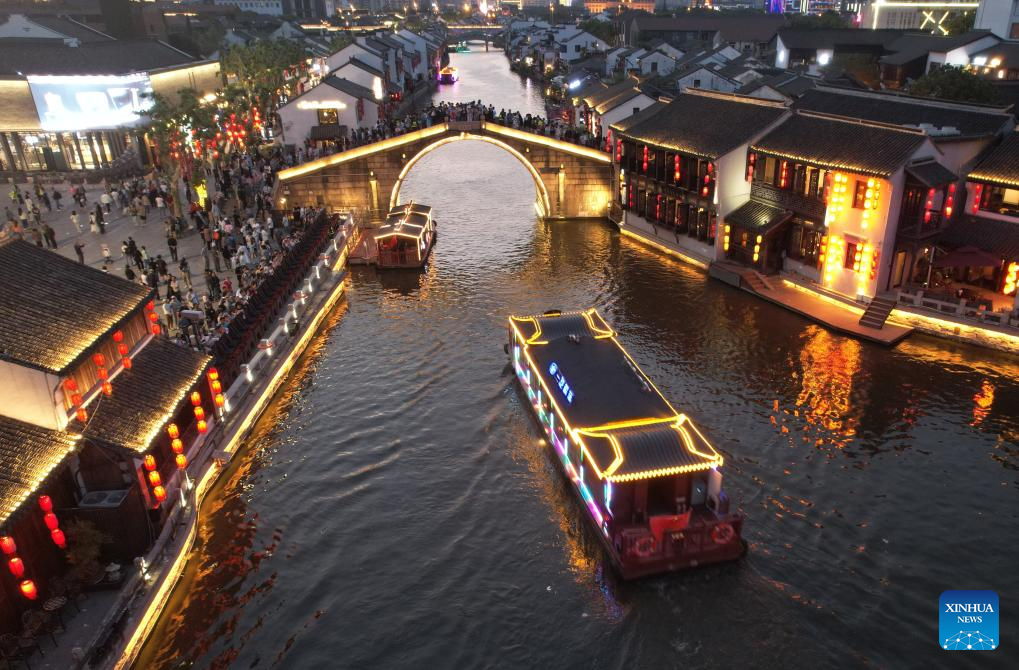 An aerial drone photo taken on May 4, 2025 shows tourists visiting the Qingming Bridge historical community in Wuxi, east China's Jiangsu Province. Chinese tourists made 314 million domestic trips and spent 180.3 billion yuan (roughly 25 billion U.S. dollars) from May 1 to 5, marking 6.4 percent and 8 percent year-on-year rises respectively, according to official figures. (Photo by Huan Yueliang/Xinhua)