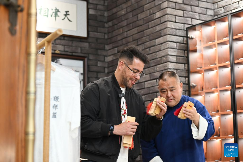 Raydis Franco (L) poses for photos with Ma Xiaochuan, the grandson of Ma Sanli, a renowned cross-talk performer, in Dongli District of north China's Tianjin, April 24, 2025. (Xinhua/Li Ran)