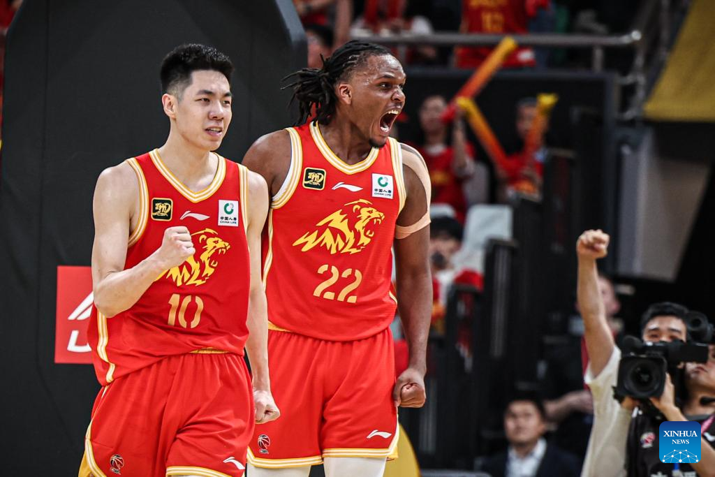 Joshua Carlton (R) of Zhejiang Lions celebrates during the playoff final 2nd round match between Zhejiang Lions and Beijing Ducks at the 2024-2025 season of the Chinese Basketball Association (CBA) league in Hangzhou, east China's Zhejiang Province, May 9, 2025. (Xinhua/Jiang Han)