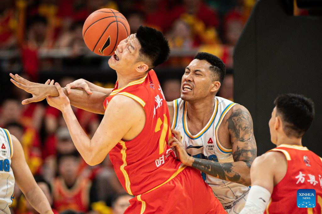 Hu Jinqiu (L) of Zhejiang Lions vies with Taruike Jianiyou of Beijing Ducks during the playoff final 2nd round match between Zhejiang Lions and Beijing Ducks at the 2024-2025 season of the Chinese Basketball Association (CBA) league in Hangzhou, east China's Zhejiang Province, May 9, 2025. (Xinhua/Jiang Han)