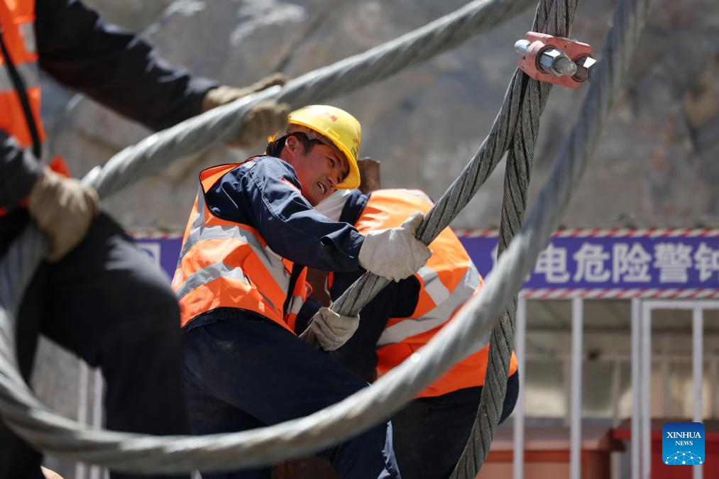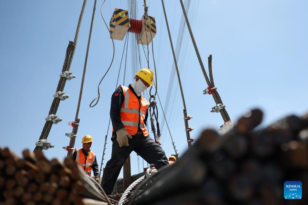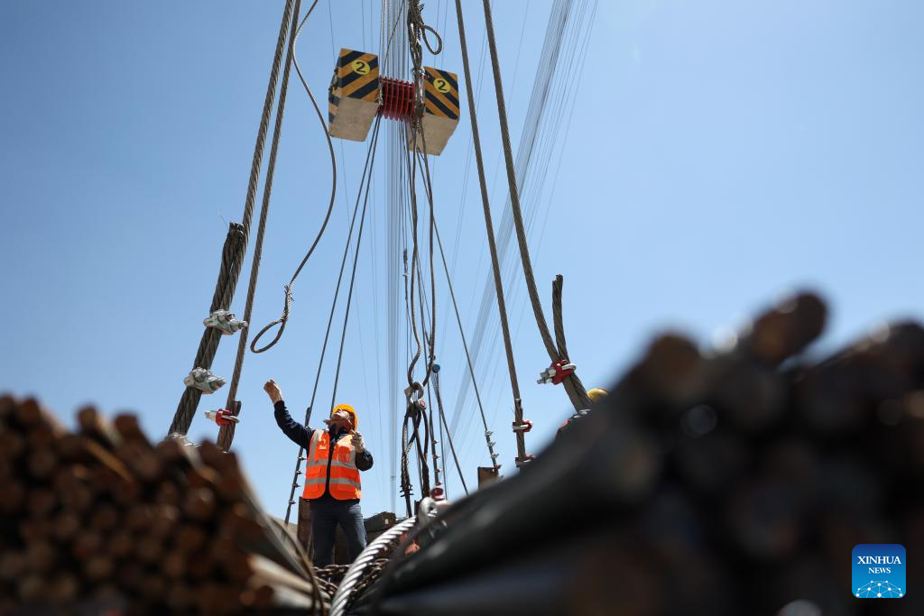 Staff members work on trial hoisting of a 500-ton cable hoisting system of the Taohe Bridge in northwest China's Gansu Province, May 10, 2025. With the successful trial hoisting of a 500-ton cable hoisting system, the construction of the main body of the 562.16-meter-long Taohe Bridge, a key project along the Lanzhou-Yongjing-Linxia expressway, started on Saturday. (Xinhua/Chen Bin)