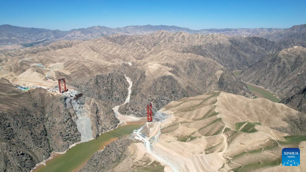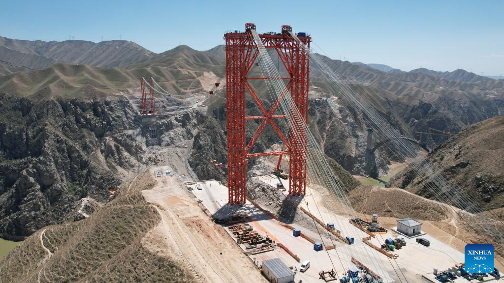 A drone photo shows a 500-ton cable hoisting system of the Taohe Bridge in northwest China's Gansu Province, May 10, 2025. With the successful trial hoisting of a 500-ton cable hoisting system, the construction of the main body of the 562.16-meter-long Taohe Bridge, a key project along the Lanzhou-Yongjing-Linxia expressway, started on Saturday. (Xinhua/Chen Bin)