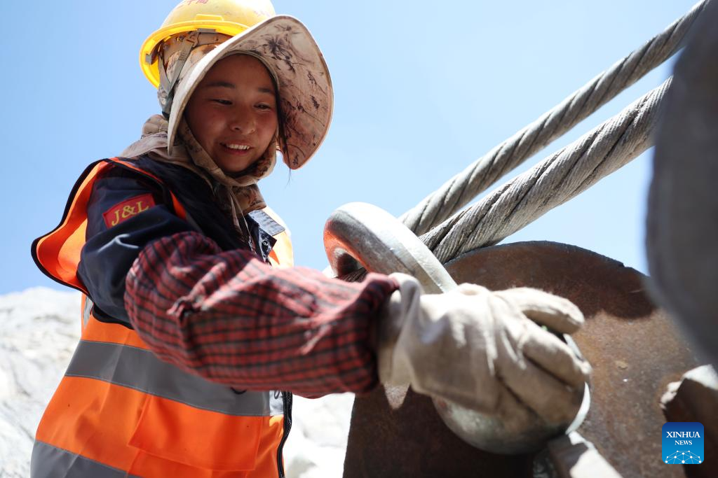 A staff member works on trial hoisting of a 500-ton cable hoisting system of the Taohe Bridge in northwest China's Gansu Province, May 10, 2025. With the successful trial hoisting of a 500-ton cable hoisting system, the construction of the main body of the 562.16-meter-long Taohe Bridge, a key project along the Lanzhou-Yongjing-Linxia expressway, started on Saturday. (Xinhua/Chen Bin)
