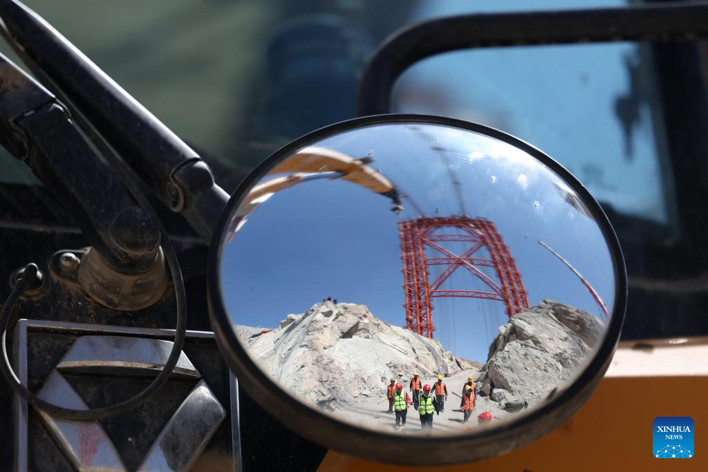 Staff members work at the construction site of the Taohe Bridge in northwest China's Gansu Province, May 10, 2025. With the successful trial hoisting of a 500-ton cable hoisting system, the construction of the main body of the 562.16-meter-long Taohe Bridge, a key project along the Lanzhou-Yongjing-Linxia expressway, started on Saturday. (Xinhua/Chen Bin)