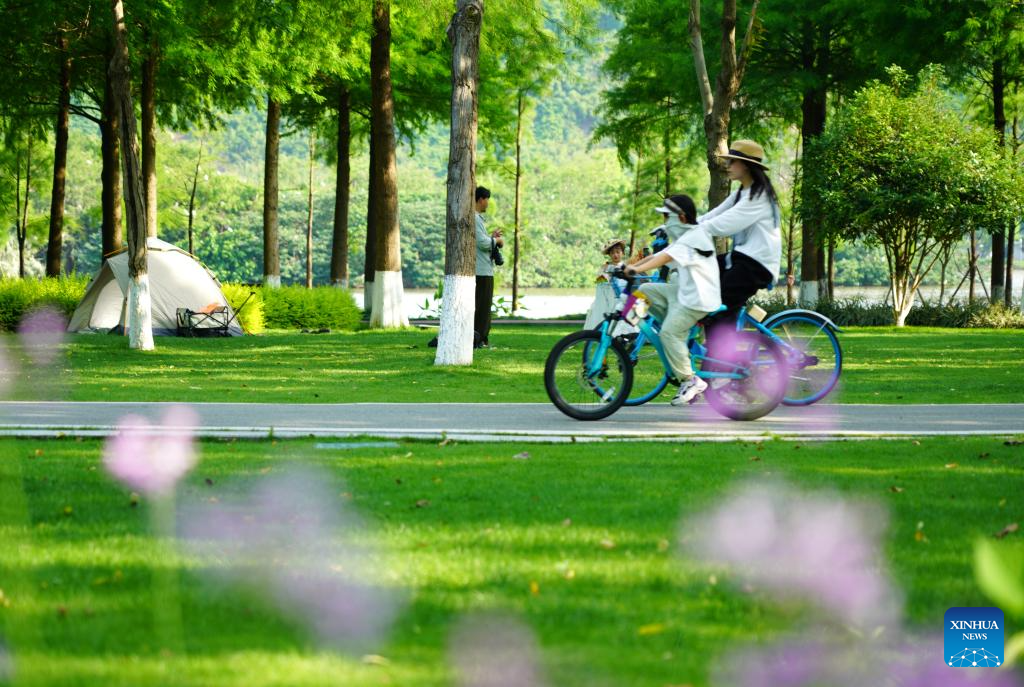 Citizens ride bicycles at a park in Yueqing, east China's Zhejiang Province, May 10, 2025. (Photo by Cai Kuanyuan/Xinhua)