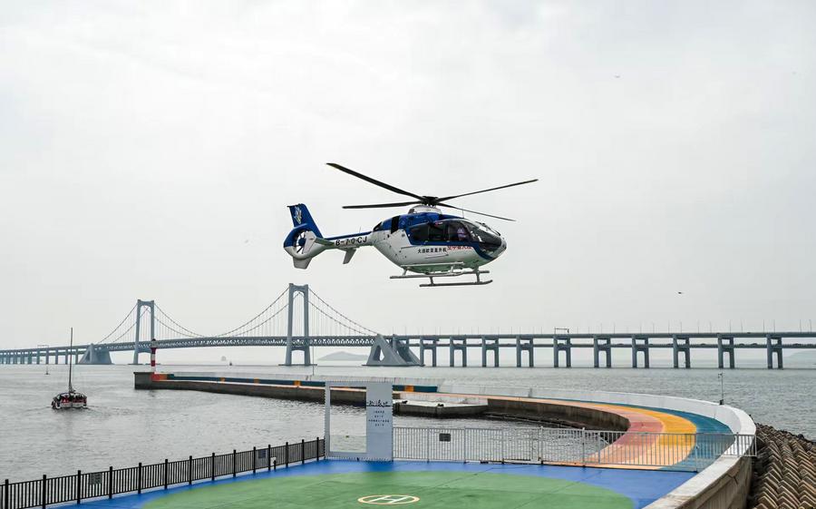 A helicopter for sightseeing flies in Dalian, northeast China's Liaoning Province, April 26, 2025. (Xinhua)