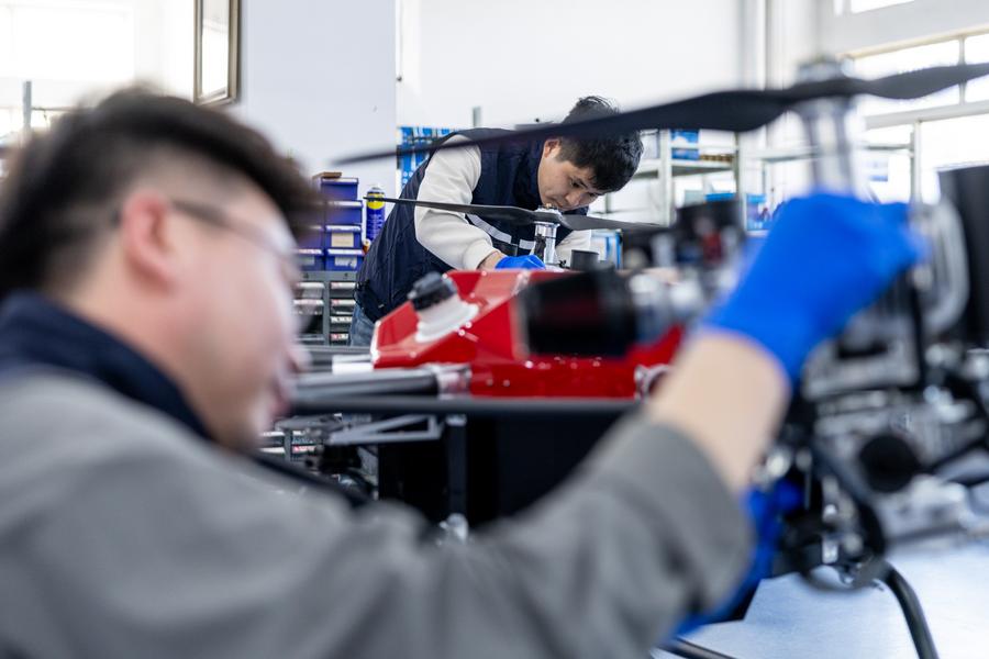 An engineer assembles an unmanned helicopter at a workshop of Faku Zhong Jun Yi UAV Technology Co., Ltd. in Faku County, in Shenyang, northeast China's Liaoning Province, April 25, 2025. (Xinhua/Pan Yulong)