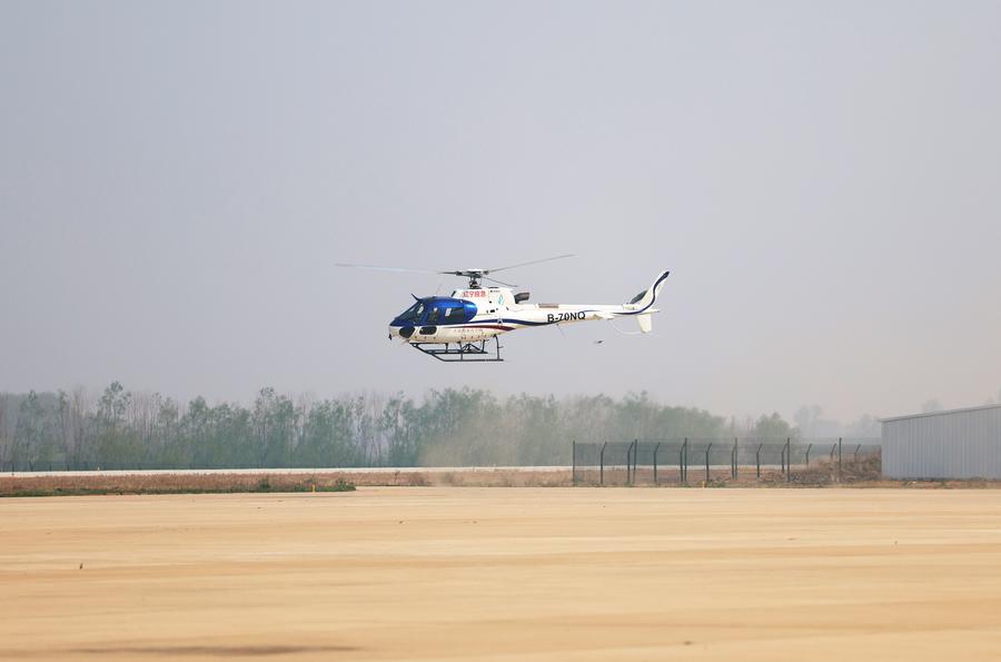 A helicopter takes off from the Shenyang general aviation industry base for forest protection operations in Faku County, in Shenyang, northeast China's Liaoning Province, April 26, 2025. (Xinhua/Yang Qing)