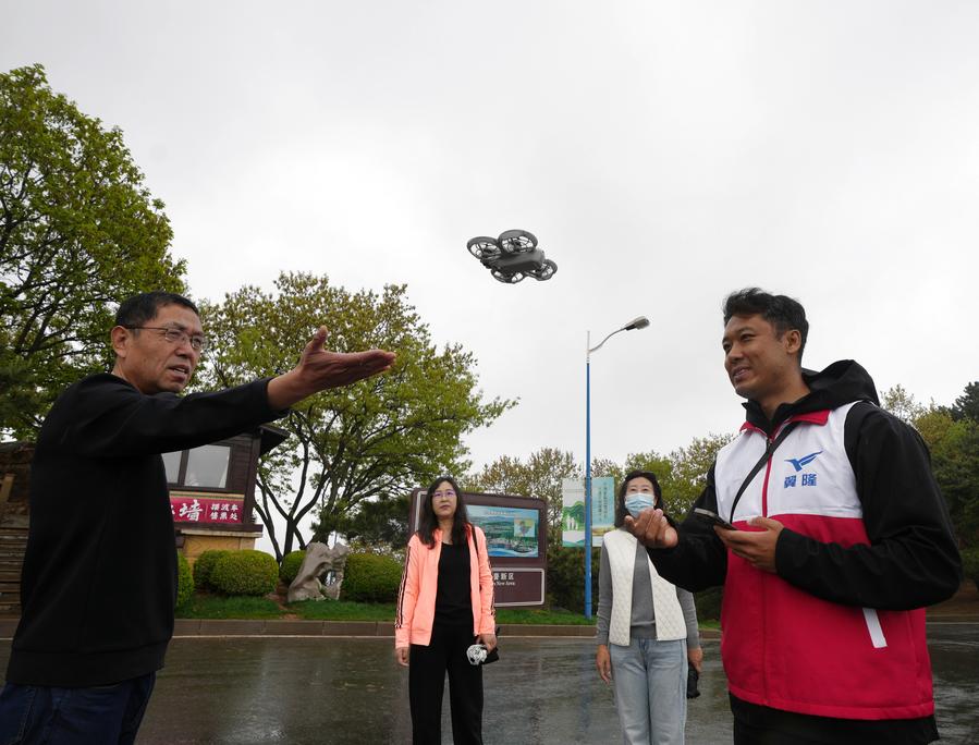 A staff member (R) of Liaoning Yilong General Aviation Co., Ltd. helps tourists try a shared drone at a scenic area in Dalian, northeast China's Liaoning Province, May 9, 2025. (Xinhua/Li Gang)