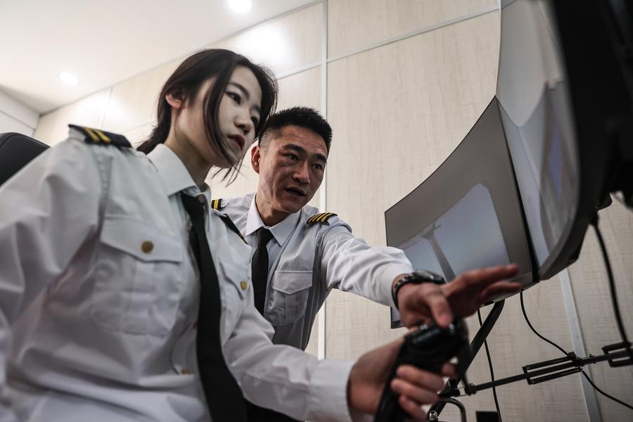 A trainee (R) attends a light sport aircraft flight training session at Liaoning Zhongzhi Yisheng Aviation Flight Academy in Faku County, in Shenyang, northeast China's Liaoning Province, April 26, 2025. (Xinhua/Chu Jiayin)