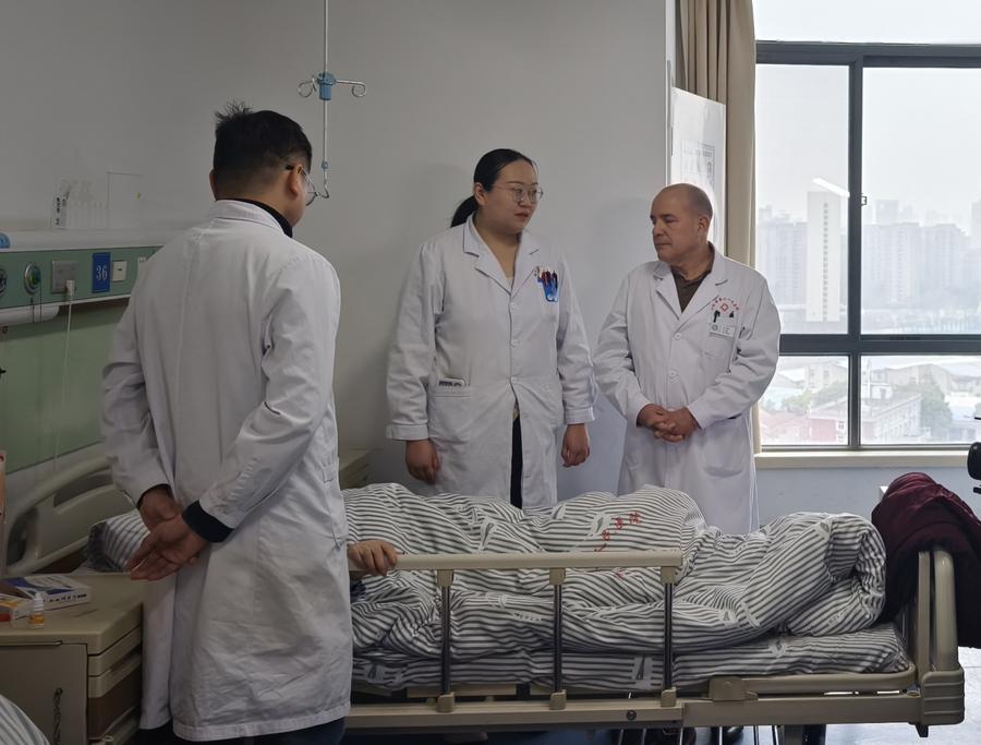 Pedro Castro (R) and Zhang Huiwen (C) conduct ward rounds at Anhui No. 2 Provincial People's Hospital in Hefei, east China's Anhui Province, Feb. 26, 2025. (Xinhua/Guo Chen)