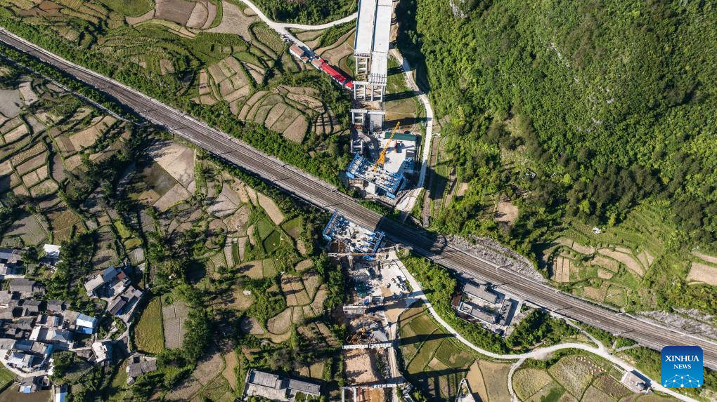 An aerial drone photo taken on May 12, 2025 shows the construction site of a bridge (R, bottom) along the Guiyang-Pingtang expressway in southwest China's Guizhou Province. With a designed speed of 100 km per hour, the Guiyang-Pingtang expressway in Guizhou has a total length of 174.018 km. According to the current progress of the project, the construction of the expressway is expected to be completed by the end of this year. (Xinhua/Tao Liang)