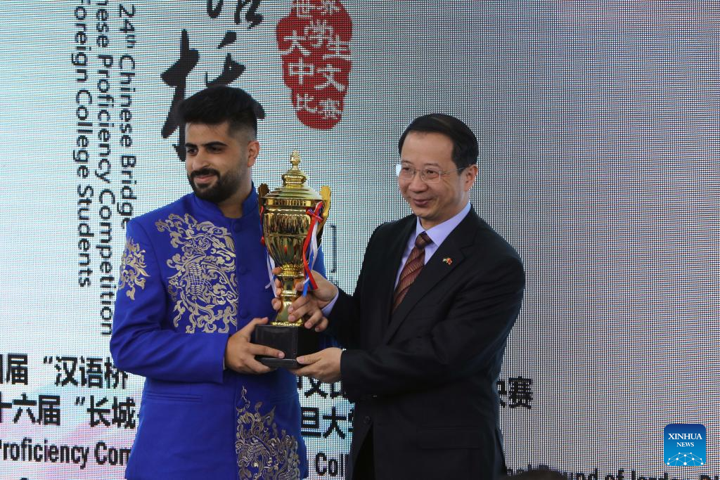 Chinese Ambassador to Jordan Chen Chuandong (R) presents the award to Younis Abu Alsondos, the first-place winner for the final of the 24th edition of the "Chinese Bridge" Chinese Proficiency Competition for Foreign College Students in Jordan, in Amman, Jordan, on May 14, 2025. The 24th edition of the "Chinese Bridge" Chinese Proficiency Competition for Foreign College Students in Jordan selected the country's champion on Wednesday to represent the country at the global finals, to be held in Beijing later this year. (Photo by Mohammad Abu Ghosh/Xinhua)