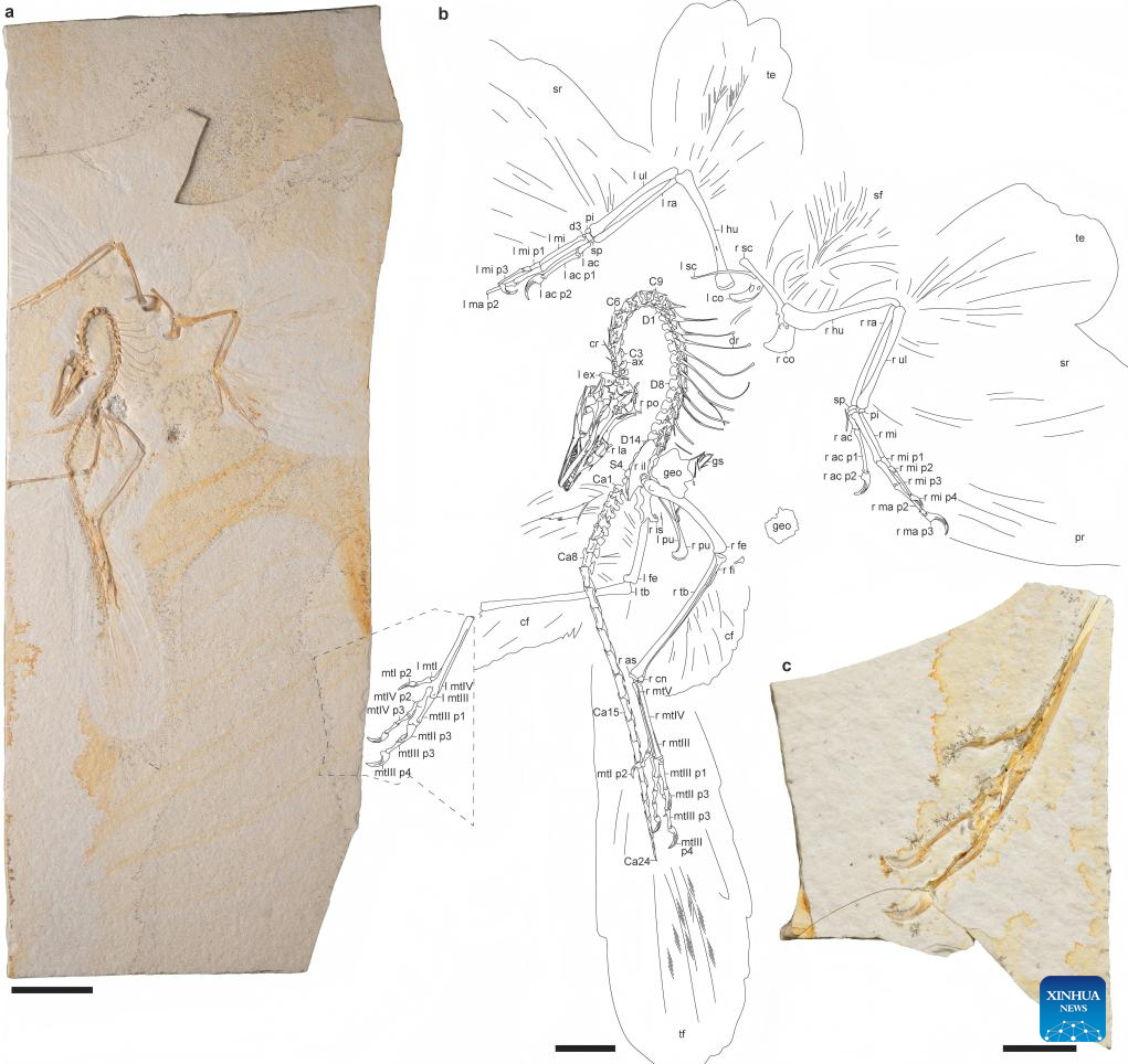 The specimen is intact, with most of its bones well-preserved. It also has rare soft tissues such as skin, toe pads and feathers, making it a landmark specimen in the research of early bird evolution, the study noted.