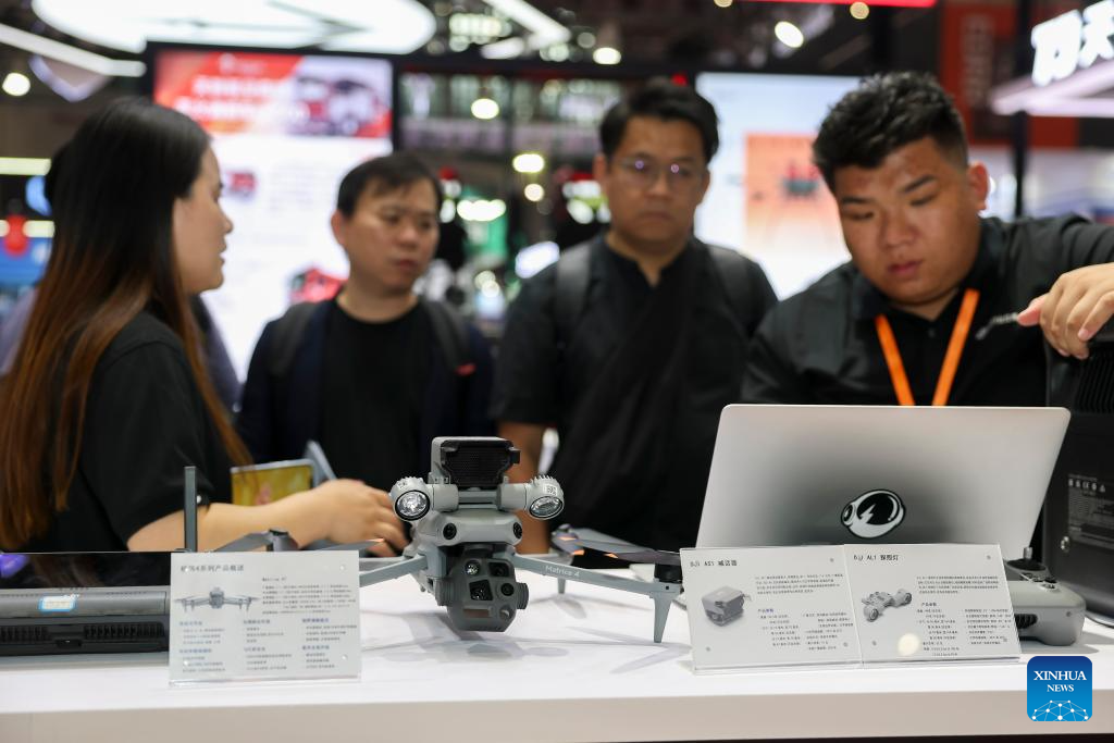 Visitors learn about the workflow of industrial drones in emergency rescue at the DJI booth during the fourth Yangtze River Delta International Emergency Disaster Reduction and Rescue Expo in Shanghai, east China, May 13, 2025. Over 3,000 cutting-edge equipment and technologies are on display at the expo.