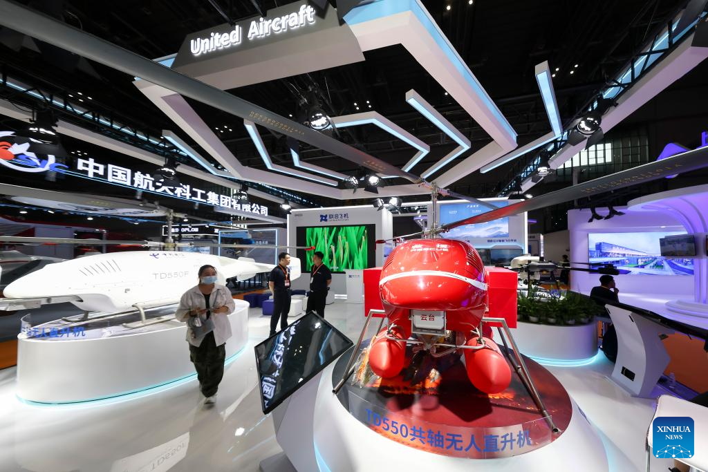 This photo taken on May 13, 2025 shows an unmanned helicopter used for emergency rescue at the booth of Chinese UAV enterprise United Aircraft at the fourth Yangtze River Delta International Emergency Disaster Reduction and Rescue Expo in Shanghai, east China. Over 3,000 cutting-edge equipment and technologies are on display at the expo.