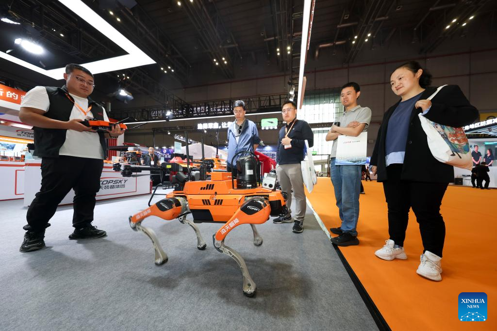 A staff member demonstrates to visitors a quadruped robot dog that can be used for emergency rescue at the booth of Beijing Topsky Intelligent Equipment Group Co., Ltd. during the fourth Yangtze River Delta International Emergency Disaster Reduction and Rescue Expo in Shanghai, east China, May 13, 2025. Over 3,000 cutting-edge equipment and technologies are on display at the expo.