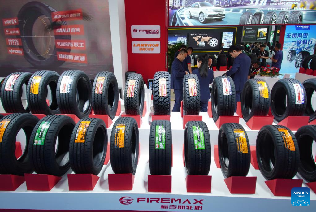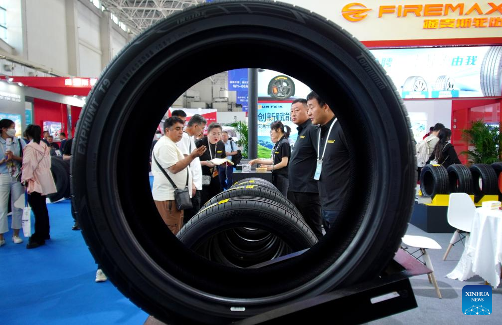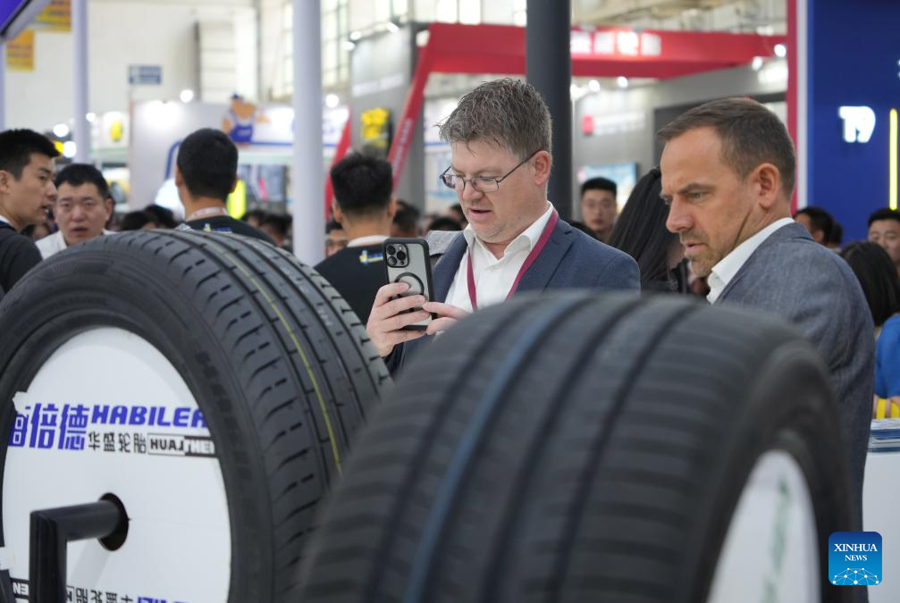 People visit the 15th China (Guangrao) International Rubber Tire & Auto Accessory Exhibition in Dongying City, east China's Shandong Province, May 15, 2025. The exhibition kicked off here on Thursday, showcasing cutting-edge technologies and innovative products across the rubber tire industry.