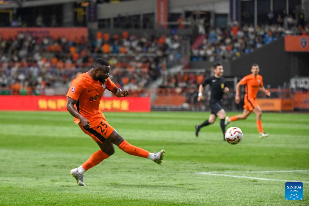 Oscar Maritu (front) of Yunnan Yukun competes during the 13th round match between Yunnan Yukun and Meizhou Hakka at the 2025 season Chinese Football Super League (CSL) in Yuxi, southwest China's Yunnan Province, May 16, 2025. (Photo by Peng Yikai/Xinhua)