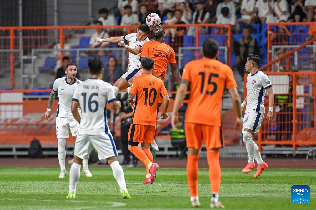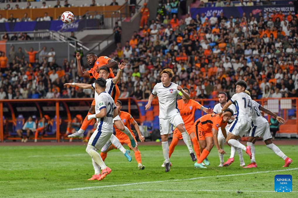 Oscar Maritu (top R) of Yunnan Yukun competes during the 13th round match between Yunnan Yukun and Meizhou Hakka at the 2025 season Chinese Football Super League (CSL) in Yuxi, southwest China's Yunnan Province, May 16, 2025. (Photo by Peng Yikai/Xinhua)
