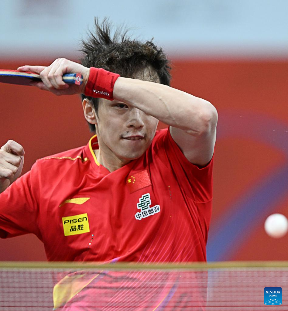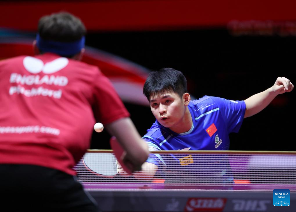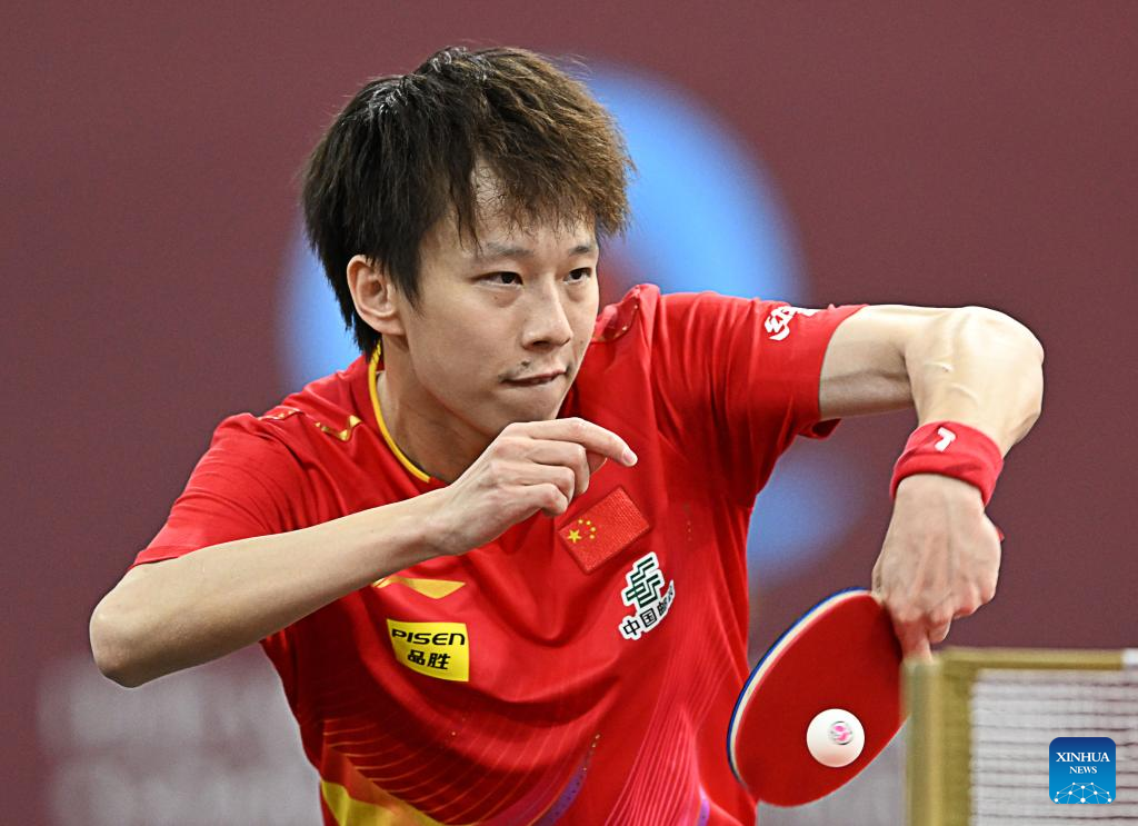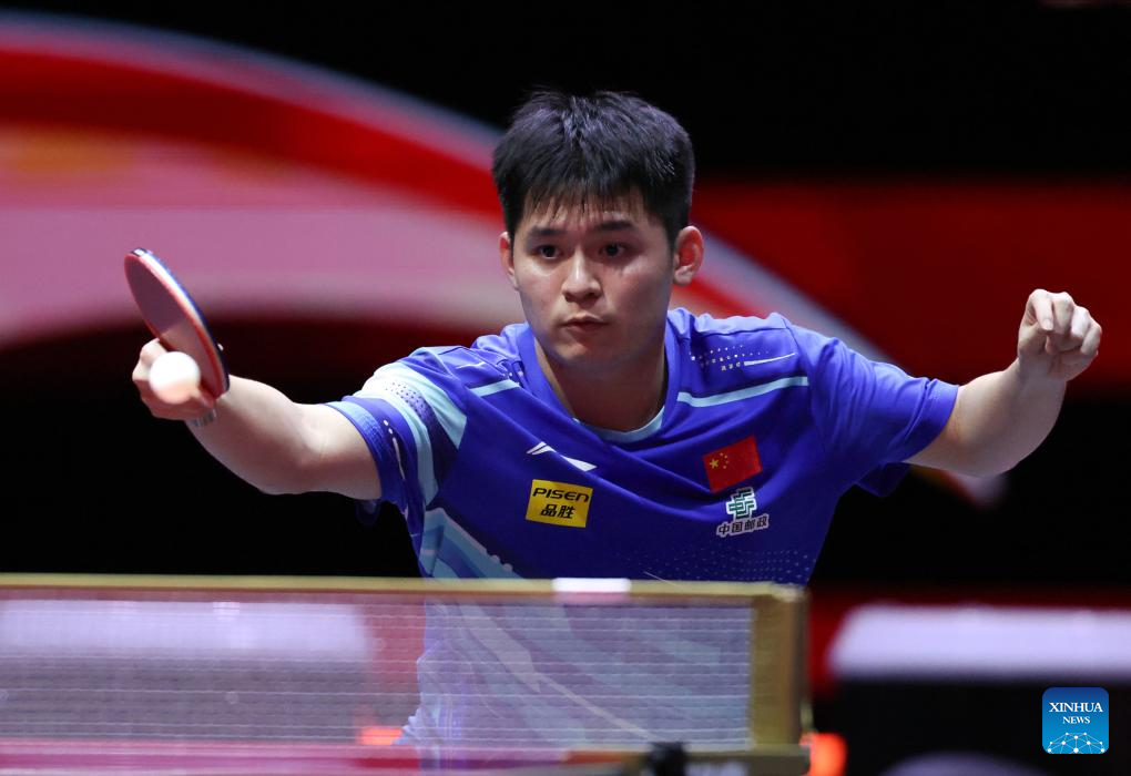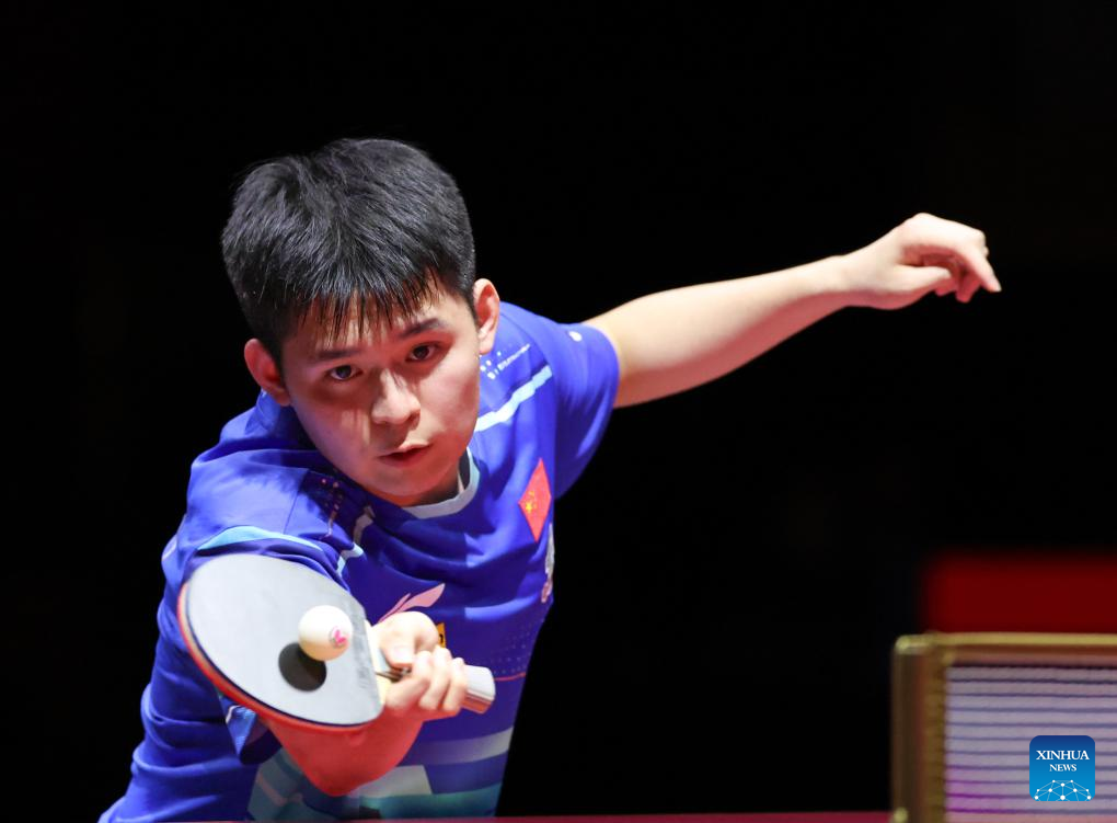 Lin Shidong competes during the men's singles round of 128 match between Lin Shidong of China and Liam Pitchford of England at ITTF World Table Tennis Championships Finals Doha 2025 in Doha, Qatar, May 18, 2025. (Xinhua/Liu Xu)