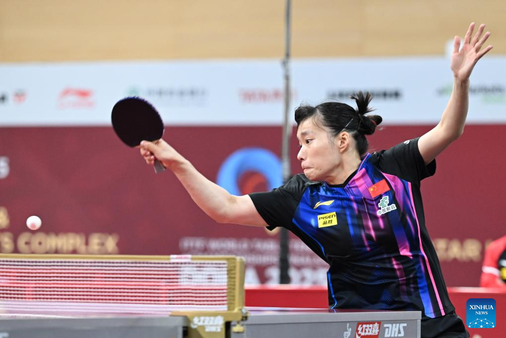 Shi Xunyao competes during the women's singles round of 128 match between Shi Xunyao of China and Lam Yee Lok of China's Hongkong at ITTF World Table Tennis Championships Finals Doha 2025 in Doha, Qatar, May 18, 2025. (Xinhua/He Changshan)