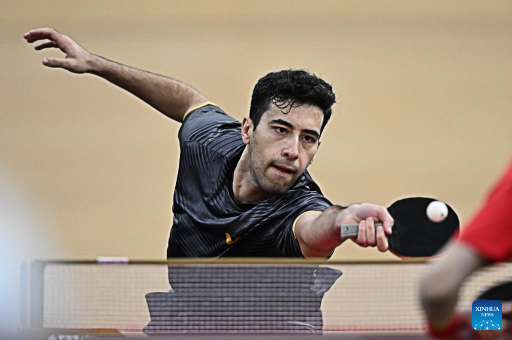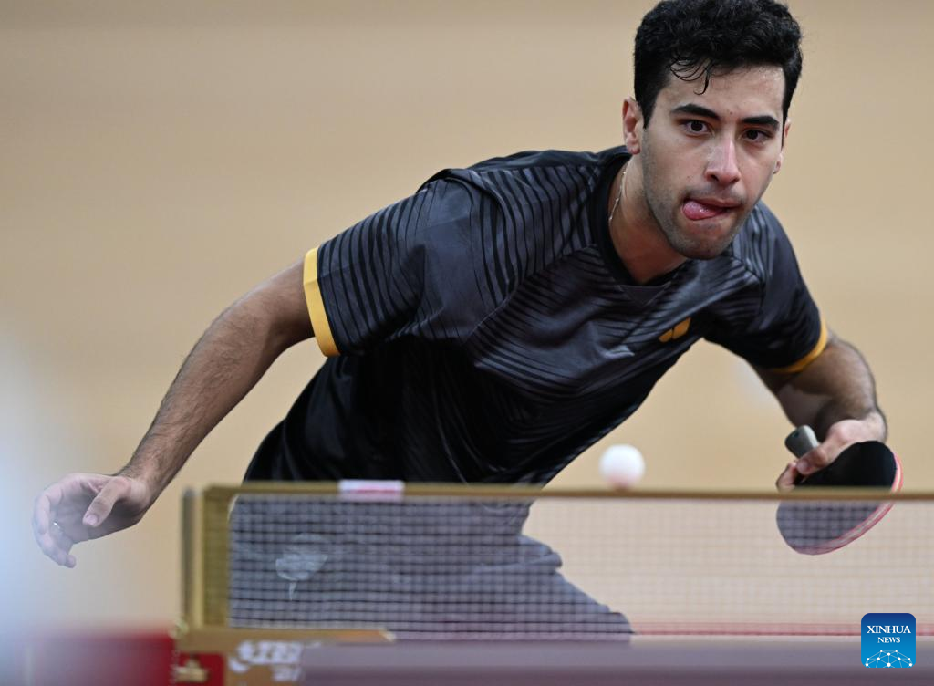 Youssef Abdelaziz hits a return during the men's singles round of 128 match between Lin Gaoyuan of China and Youssef Abdelaziz of Egypt at ITTF World Table Tennis Championships Finals Doha 2025 in Doha, Qatar, May 18, 2025. (Xinhua/He Changshan)