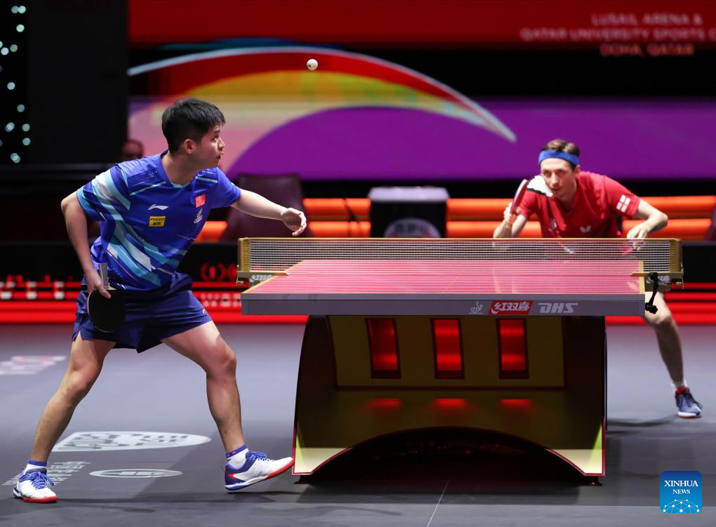 Lin Shidong (R) hits a return during the men's singles round of 128 match between Lin Shidong of China and Liam Pitchford of England at ITTF World Table Tennis Championships Finals Doha 2025 in Doha, Qatar, May 18, 2025. (Xinhua/Liu Xu)