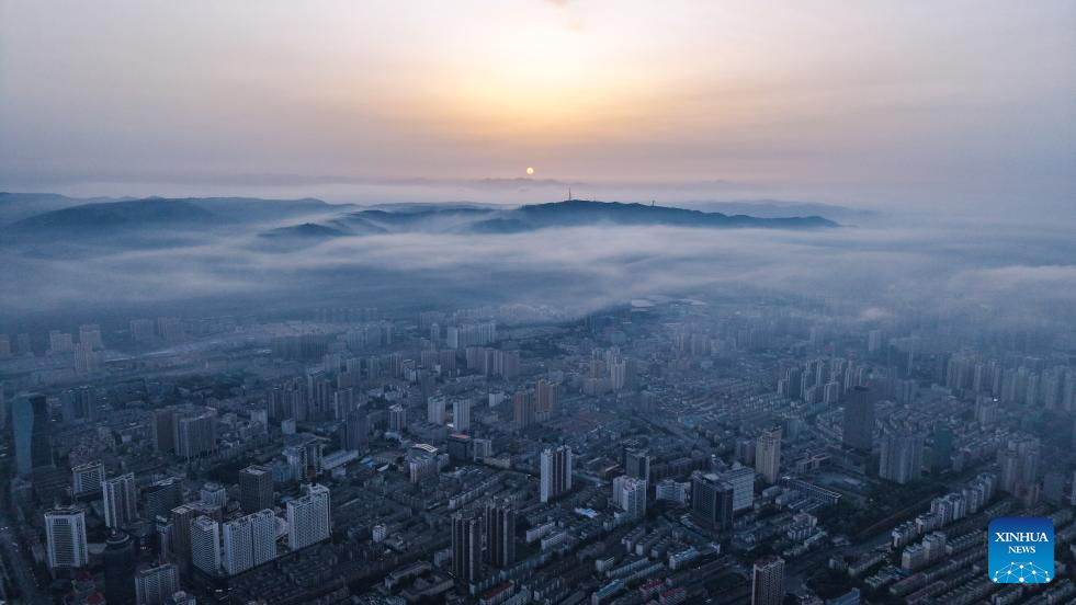 An aerial drone photo taken on May 22, 2025 shows the sunrise scenery in Xining, northwest China's Qinghai Province. (Xinhua/Qi Zhiyue)