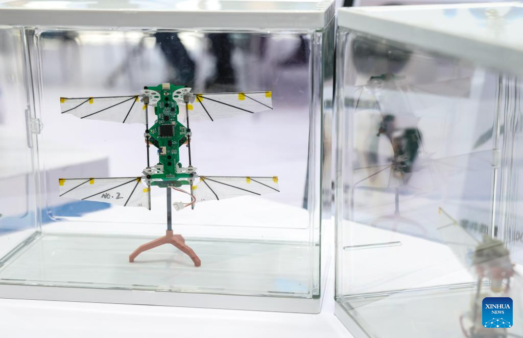 A micro bionic insect aircraft is pictured at a drone expo in Shenzhen, south China's Guangdong Province, May 23, 2025. The 9th Drone World Congress 2025, International Low Altitude Economy and UAS Expo 2025 and the 10th Shenzhen International UAV Expo kicked off on Friday. Over 800 companies with more than 5,000 drone products participated in the expo. (Xinhua/Mao Siqian)