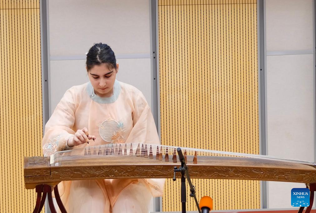 A contestant performs during the Czech national qualifications for the 24th "Chinese Bridge," the Chinese language proficiency competition for foreign college students in Prague, the Czech Republic, May 22, 2025. (Xinhua/Deng Yaomin)