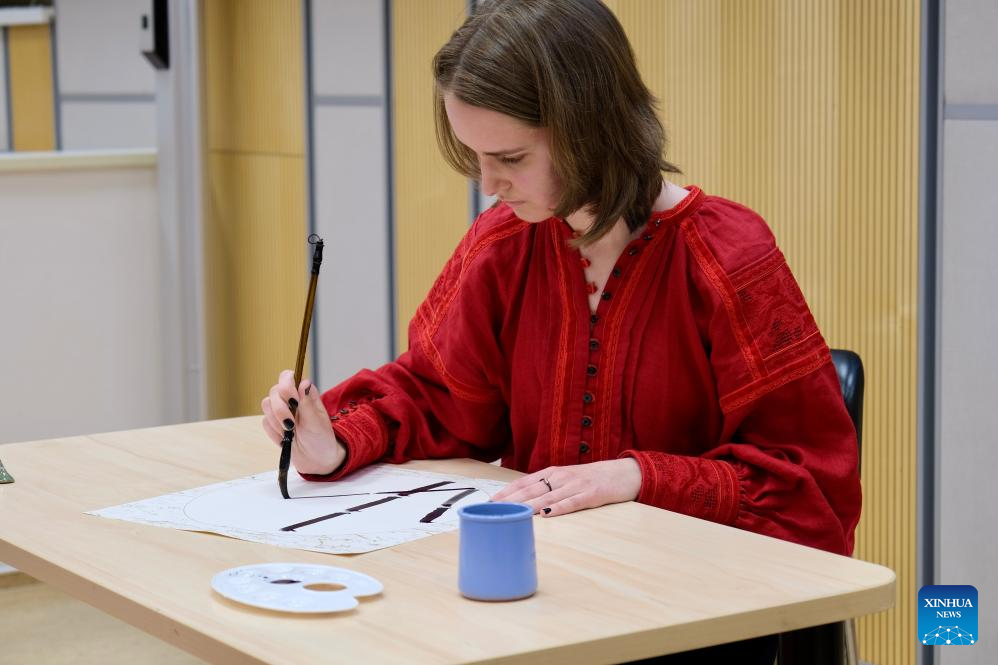 A contestant draws traditional Chinese painting during the Czech national qualifications for the 24th "Chinese Bridge," the Chinese language proficiency competition for foreign college students in Prague, the Czech Republic, May 22, 2025. (Xinhua/Deng Yaomin)