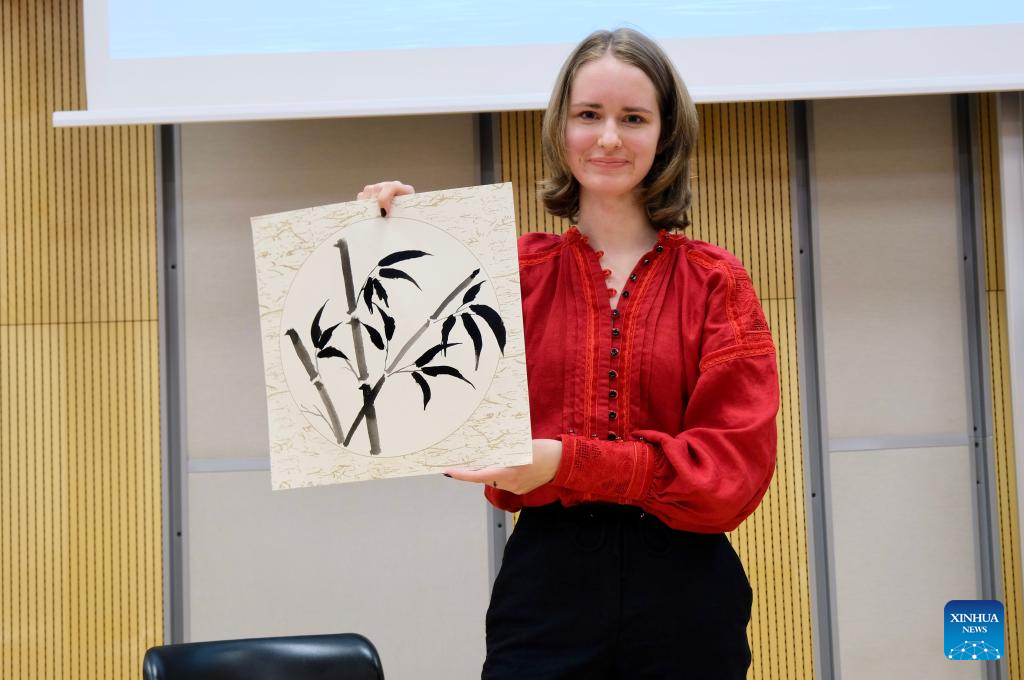 A contestant shows her traditional Chinese painting during the Czech national qualifications for the 24th "Chinese Bridge," the Chinese language proficiency competition for foreign college students in Prague, the Czech Republic, May 22, 2025. (Xinhua/Deng Yaomin)