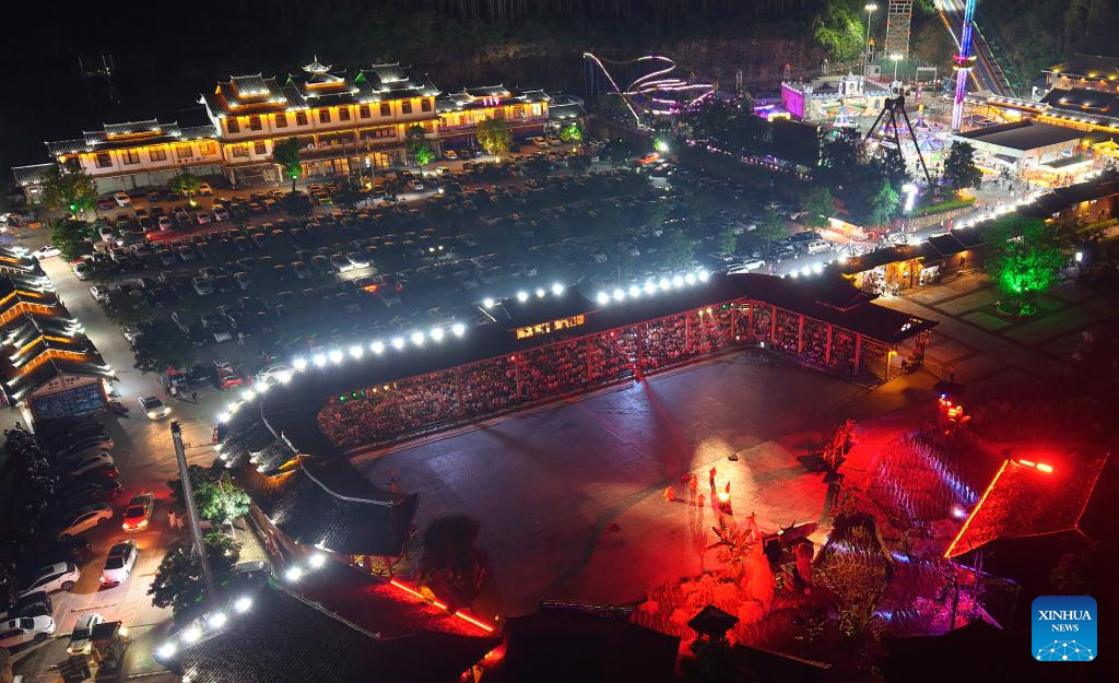 An aerial drone photo shows tourists watching a folk performance at Mengwu Miao Village in Rongshui Miao Autonomous County of Liuzhou City, south China's Guangxi Zhuang Autonomous Region, May 3, 2025. In recent years, Guangxi has been continuously focusing on the upgrade of consumption experience and promoting the integration of cultural tourism and commerce. Various night fairs and booths have boosted consumption and injected vitality into the night economy. (Xinhua/Huang Xiaobang)