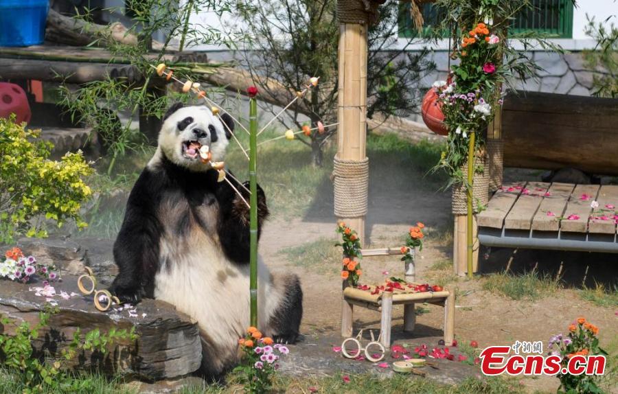 Giant panda Ya Ji enjoys a special cake to celebrate its 11th birthday at Jinan zoo in east China's Shandong Province, May 25, 2025. (China News Service/Zhang Yong)