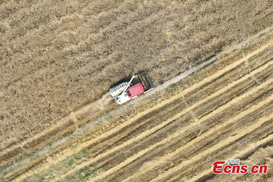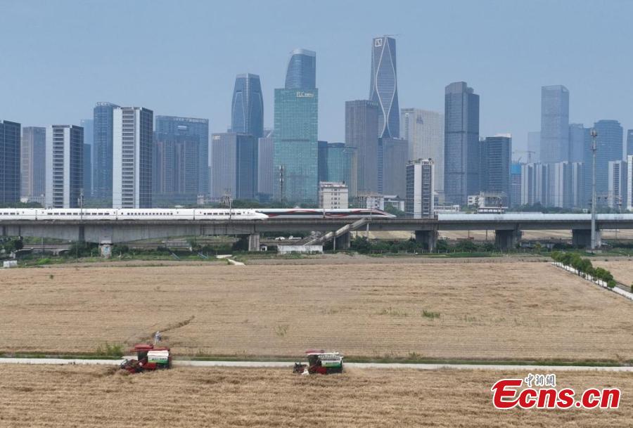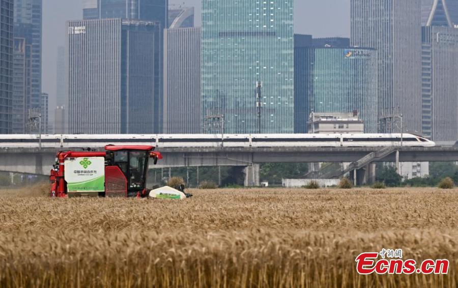 Harvesters work in a wheat field near Hangzhou's CBD, east China's Zhejiang Province, May 26, 2025. (China News Service/Wang Gang)