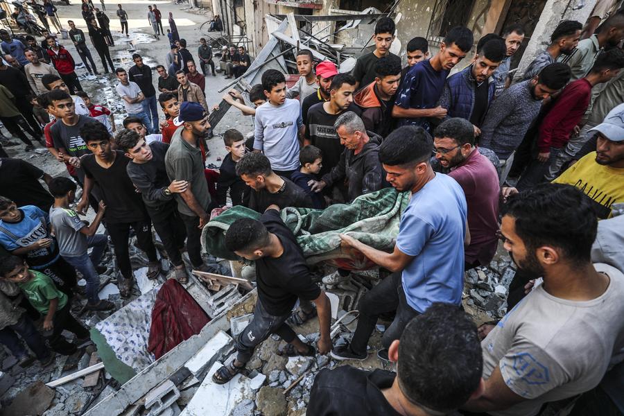 Palestinians transfer a victim after an Israeli airstrike in Jabalia refugee camp, northern Gaza Strip, on May 23, 2025. (Photo by Mahmoud Zaki/Xinhua)
