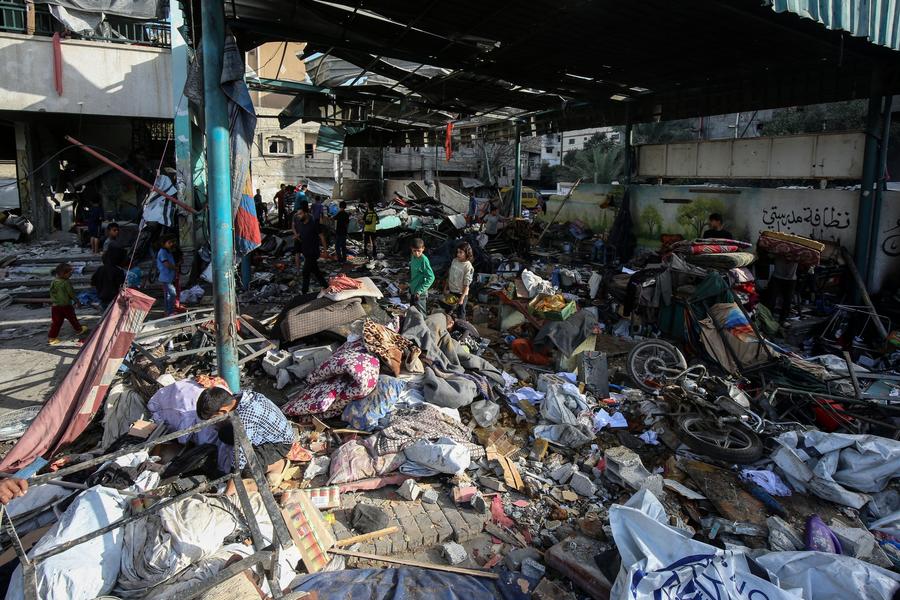 Palestinians are seen at the Fahmi Al-Jarjawi school after an Israeli airstrike in Gaza City, on May 26, 2025. (Photo by Rizek Abdeljawad/Xinhua)