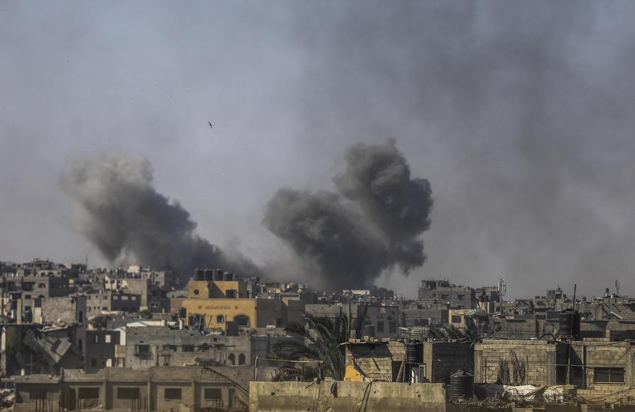 Smoke rises following an Israeli airstrike in Jabalia refugee camp, northern Gaza Strip, on May 24, 2025. (Photo by Mahmoud Zaki/Xinhua)