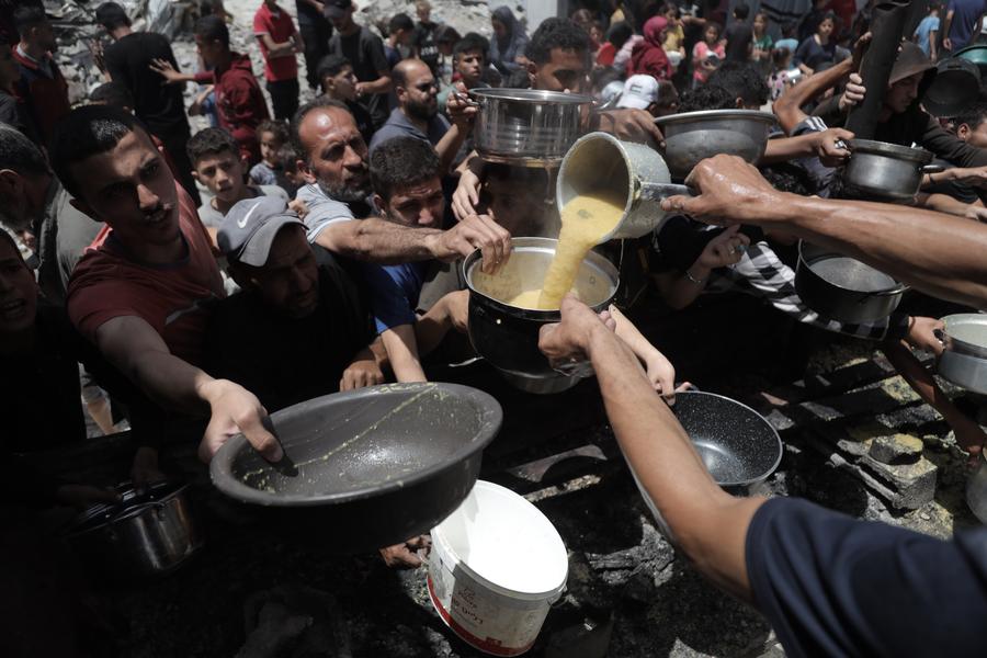 Palestinians receive free food at a food distribution center in Jabalia refugee camp, northern Gaza Strip, on May 19, 2025. (Photo by Abdul Rahman Salama/Xinhua)