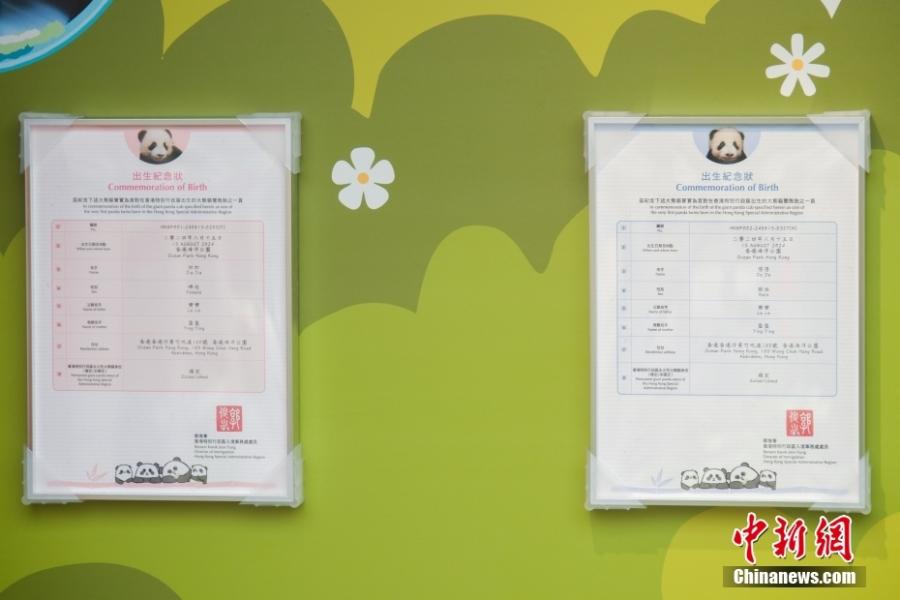 Birth certificates are displayed at the Giant Panda Adventure area of the Ocean Park in the Hong Kong Special Administrative Region, May 27, 2025. (China News Service/Chen Yongnuo)