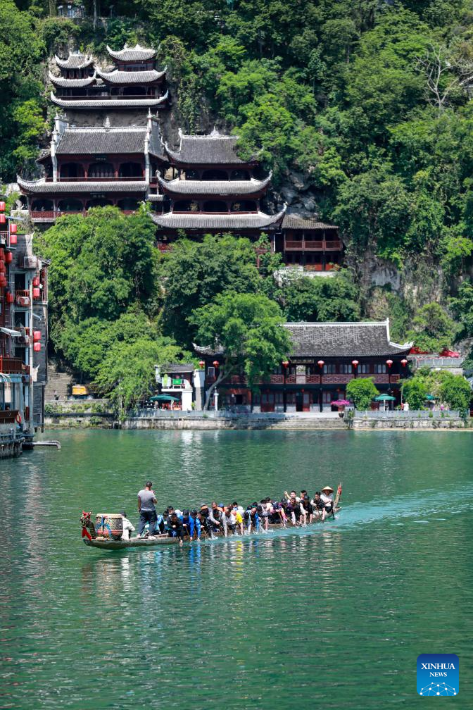This photo taken on May 20, 2025 shows a view of Qinglong Cave Complex built on the cliff in Zhenyuan ancient town in Qiandongnan Miao and Dong Autonomous Prefecture in southwest China's Guizhou Province. The architectural complex, located on a 300-meter-long and 80-meter-high cliff, is a model of the integration of architectural characters between the north and the south of China. (Xinhua/Ou Dongqu)